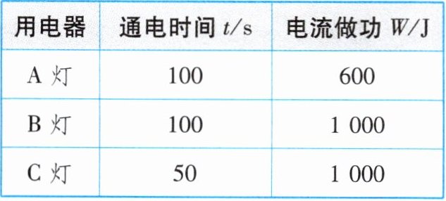 (3)计算单位时间内电流做功多少(即功率)比较。A灯功率:$P_{A}=\frac{W_{A}}{t_{A}}=\frac{600J}{100s}=6W$;C灯功率:$P_{C}=\frac{W_{C}}{t_{C}}=\frac{1000J}{50s}=20W$,$P_{C}>P_{A}$,故C灯做功快。