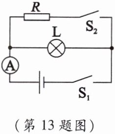 13. 如图所示,电源电压保持不变,小灯泡 L 标有“6 V 0.6 W”,R 为定值电阻,闭合开关 $ S_{1} $,断开开关 $ S_{2} $,小灯泡正常发光;若再闭合开关 $ S_{2} $,发现电流表示数变化了 0.3 A,则 R 的阻值为