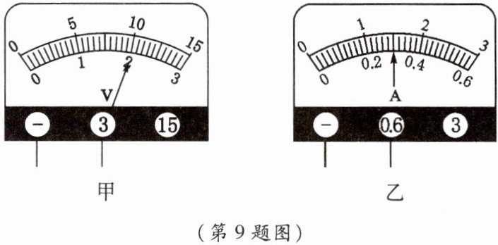 9. 小岩利用电压表和电流表测量小灯泡的电功率,实验过程中,与小灯泡并联的电压表的示数如图甲所示,与小灯泡串联的电流表的示数如图乙所示,则电压表的示数为