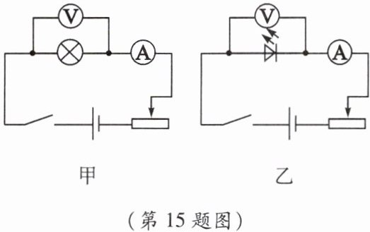 15. 如图所示,小梦设计了下面两个电路图来比较小灯泡(白炽灯)和发光二极管的发光情况(发光二极管简称为 LED,是半导体二极管的一种,可以把电能直接转化成光能,不同于白炽灯的高温发光,它几乎不产生热量,发光效率高)。