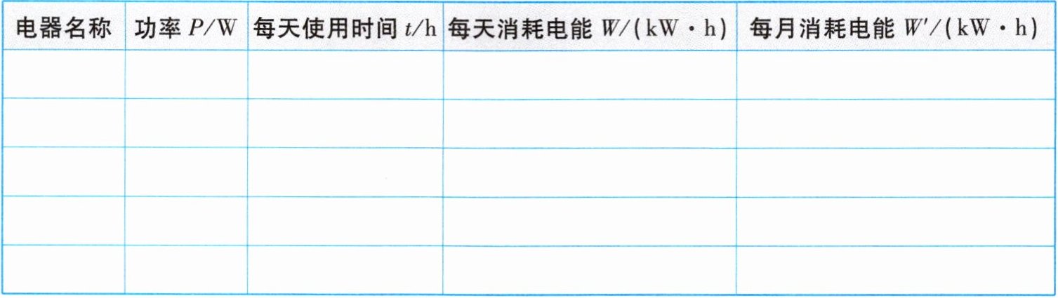 |电器名称|功率$ P/W $|每天使用时间$ t/h $|每天消耗电能$ W/(kW\cdot h) $|每月消耗电能$ W'/(kW\cdot h) $|