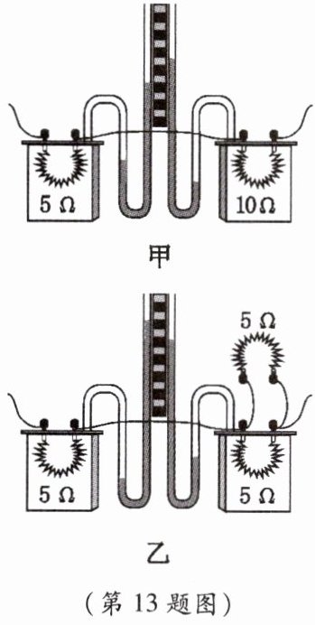13. 小梦在探究电流通过导体产生热量的多少与什么因素有关时采用了如图所示的实验装置,请你仔细观察甲、乙两图,回答下列问题。