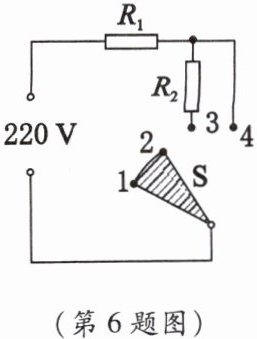 6. 电热加湿器的工作原理是:加湿器水箱中的部分水通过进水阀门进入电热槽中受热至沸腾,产生的水蒸气通过蒸汽扩散装置喷入空气中,从而提高空气湿度。下表是某同学设计的电热加湿器的部分参数,其发热电路如图所示,$R_{1}$、$R_{2}$为阻值相同的发热电阻,$1$、$2$、$3$、$4$为触点,$S$为旋转型开关,实现关、低挡、高挡的转换。