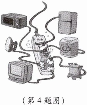 4. 如图所示的家庭电路中,如果在一个插线板上同时使用的用电器过多,可能会引发火灾。请你用所学过的电学知识来解释原因。