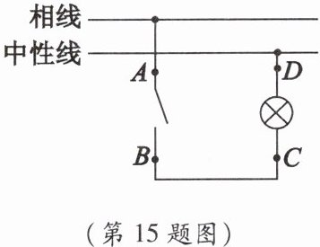 15. 小明家里的一盏电灯不能发光了,换上新的电灯,还是不能发光。于是小明拿来测电笔,闭合开关后,分别在图中A、B、C、D四个位置进行测试,测电笔氖管均能发光。则电路故障是(