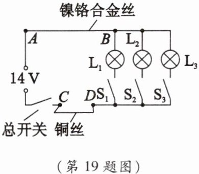 19. 如图所示的实验装置是保险丝作用演示器,它是一个由三盏灯组成的并联电路,电源电压保持不变。在实验过程中,如果将C、D两点间接入的保险丝更换为铜丝,干路总开关闭合,当三盏灯全部接入电路一段时间后,接在A、B两点间的镍铬合金丝的绝缘外皮就会燃烧起来。请你利用所学知识回答: