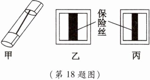 18. 为了防止电流过大将用电器核心部件烧毁,很多用电器都装有保险管,如图甲所示。乙、丙两图分别是两个保险管的截面图,若两管内保险丝的材料相同,长度相同,粗细不同,则两图中