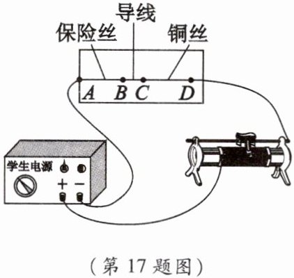 17. 长短、粗细均相同的保险丝和铜丝,分别接到线路板上A、B间和C、D间,如图所示,移动滑动变阻器的滑片,发现保险丝熔断而铜丝完好。下列说法错误的是(