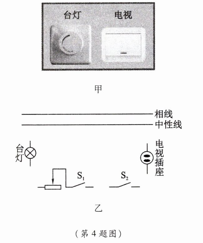 4. 图甲是宾馆床头柜上的开关示意图,图乙是其控制的电路,其中 $ S_{1} $ 为旋钮开关,单独控制台灯的通断和亮度,$ S_{2} $ 为单独控制电视插座的开关。请在图乙中将电路图连接完整,要求符合安全用电原则。