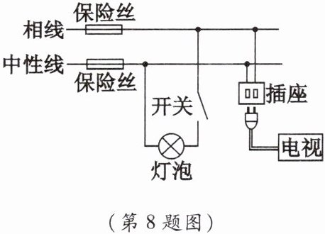 8. 如图所示的家庭电路中,将插头插入插座,打开电视,电视不工作;闭合开关,灯泡不亮;保持开关闭合,拔出插头,将测电笔分别插入插座两孔时氖管均发光。若电路中只有一处故障,则故障可能是 (