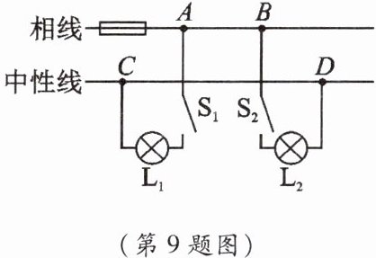 9. 如图所示是家庭电路中的某一部分,电工师傅按下面的顺序进行检测:①闭合开关 $ S_{1} $,灯 $ L_{1} $ 亮;②断开开关 $ S_{1} $,闭合开关 $ S_{2} $,灯 $ L_{2} $ 不亮;③再用测电笔测试 A、B、C、D 四个接线点,发现只有在 C 点氖管不发光。若电路中只有一处故障,则是 (