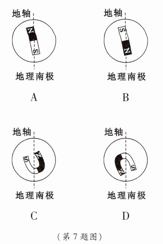 7. 假想地磁场是由地球内部一块大磁体产生的,如图所示的四个示意图中,能合理描述这块大磁体的是