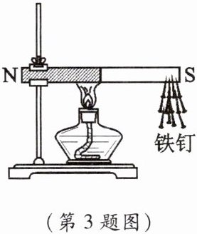 3. 小红想探究磁体的磁性强弱是否与温度有关,她设计了如图所示的实验,将一条形磁体的一端固定在铁架台上,另一端吸着一些小铁钉,用酒精灯给磁体加热。经过一段时间后,当磁体被烧红时,铁钉纷纷落下,说明温度越高,磁性越