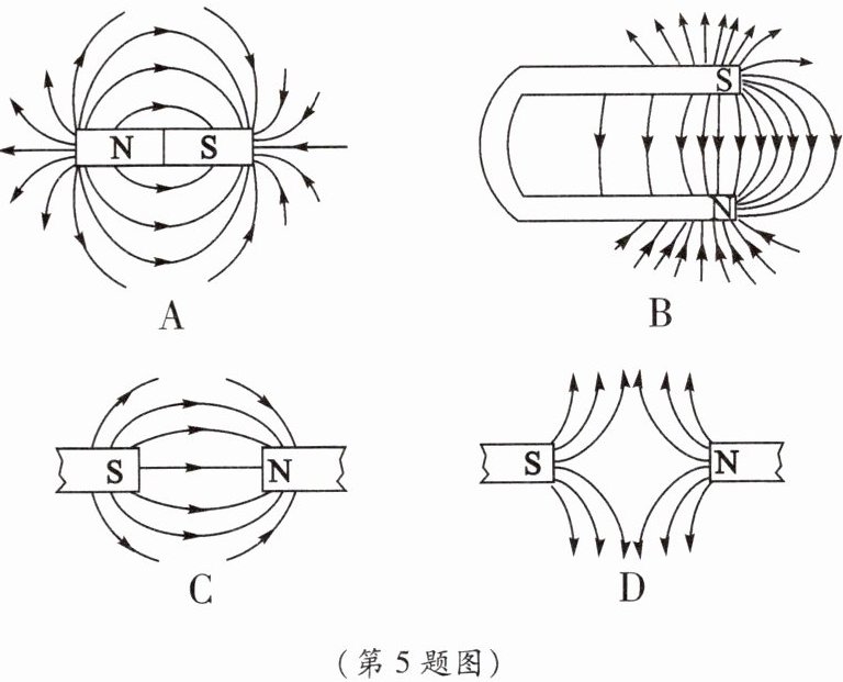 5. 物理学是美的,许多物理现象都具有对称美、平衡美和曲线美。下列优美的曲线中,用磁感线描述磁体外部磁场正确的是