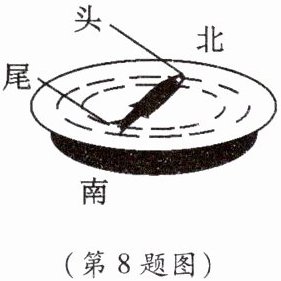 8. 如图所示,《武经总要》记载了“指南鱼”:有磁性的空心铁鱼漂浮在水中,多次轻轻旋转铁鱼,静止后鱼尾总是指向南方。下列说法正确的是