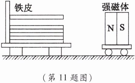 11. 如图所示是某同学发明的“铁皮自动分开装置”。将强磁体靠近一叠铁皮,被磁化后的铁皮会自动分开。铁皮自动分开的原因是