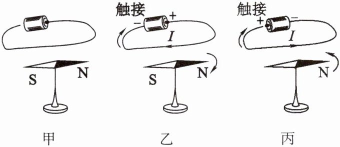 ③将电源正、负极对调,再次触接电源,小磁针的N极向纸内偏转,如图丙。