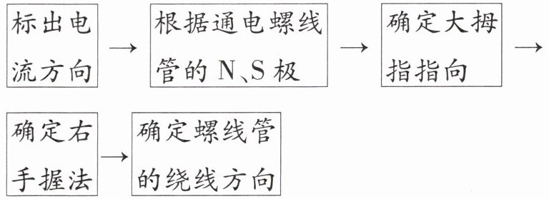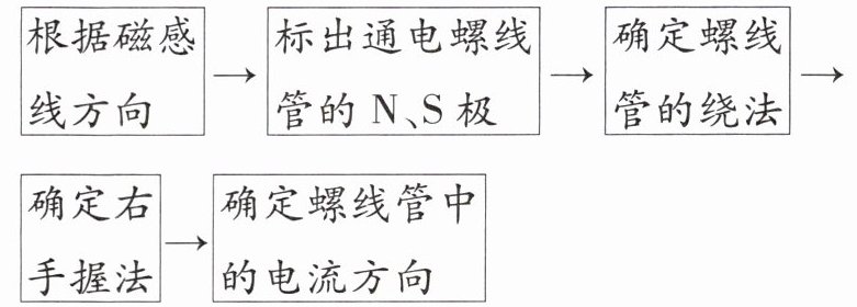 $ 根据磁感线方向 \rightarrow 标出通电螺线管的N、S极 \rightarrow 确定螺线管的绕法 \rightarrow 确定右手握法 \rightarrow 确定螺线管中的电流方向 $