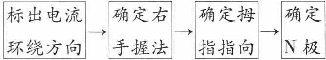 $ 标出电流环绕方向 \rightarrow 确定右手握法 \rightarrow 确定拇指指向 \rightarrow 确定N极 $