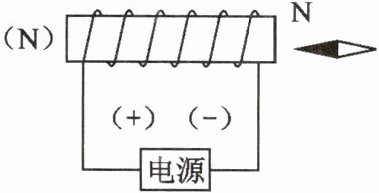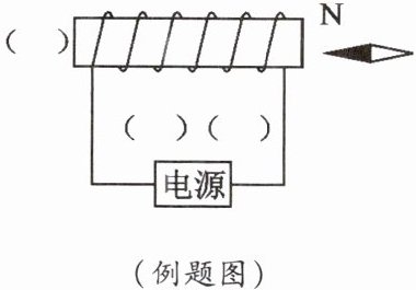 如图所示,请根据小磁针的指向,在电源上方的括号中标出电源的正、负极,并在螺线管左端的括号中标明螺线管左端的极性。