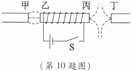 10. 条形磁体和通电螺线管如图放置,虚线表示磁感线,磁极甲、乙、丙、丁的极性依次是(