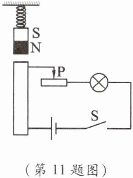 11. 如图所示,螺线管正上方用弹簧挂着一根条形磁体,当开关S闭合后,滑片P从右端向左端滑动过程中,弹簧长度变长。画出符合上述要求的螺线管的绕线。