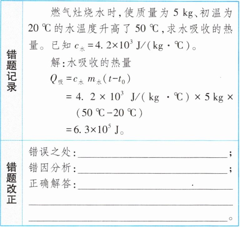 |错题记录|燃气灶烧水时,使质量为$5kg$、初温为$20^{\circ}C的水温度升高了50^{\circ}C$,求水吸收的热量。已知$c_{水}= 4.2×10^{3}J/(kg\cdot^{\circ}C)$。解:水吸收的热量$\begin{align}Q_{吸}&= c_{水}m_{水}(t - t_{0})\\&=4.2×10^{3}J/(kg\cdot^{\circ}C)×5kg×(50^{\circ}C - 20^{\circ}C)\\&=6.3×10^{5}J。\end{align} $|