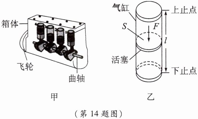 14. 如图甲所示为四缸发动机的工作原理:内燃机通过连杆把四个气缸的活塞连在一根曲轴上,并使各气缸的做功冲程错开,在飞轮转动的每半周里,都有一个气缸在做功,其他三个气缸分别在做吸气、压缩和排气工作。