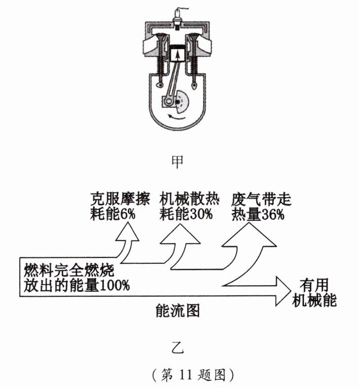 11. 汽车是现代生活中最常见的一种交通工具,如图甲、乙所示分别是某汽油机的某冲程及能量流向图。下列说法正确的是 (