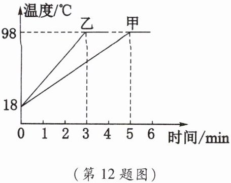 12. 小美在老师的指导下进行了以下实验:甲、乙两烧杯各装100g水,用酒精灯加热甲烧杯,用煤油灯加热乙烧杯,直至烧杯内水沸腾1min后熄灭该灯,测得消耗酒精4g、煤油2.5g。她根据实验数据绘制了水温与加热时间关系的图像(如图)。若水沸腾前质量不改变,同一杯水沸腾前后单位时间内吸收的热量相等,$q_{酒精}= 3.0×10^{7}J/kg$,$q_{煤油}= 4.6×10^{7}J/kg$,$c_{水}= 4.2×10^{3}J/(kg\cdot^{\circ}C)$,则下列说法正确的是 (