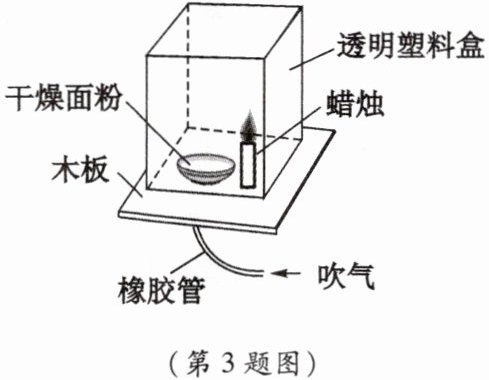 3. 如图所示,在水平桌面上放置一个底部接通橡胶管的塑料小碗,小碗中放入适量干燥面粉,点燃蜡烛,再罩上一个透明塑料盒,从橡胶管一端快速吹气,使面粉充满整个塑料盒,飞扬的面粉在接触到烛焰瞬间被点燃引发爆炸,塑料盒被冲飞。面粉燃烧时将