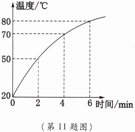 11. 某物理兴趣小组的同学用煤炉给100kg的水加热,同时他们绘制了如图所示的加热过程中水的温度随时间变化的图像。若在6min内完全燃烧了2kg的煤,水的比热容为$4.2×10^3J/(kg·℃),2kg$的煤完全燃烧放出的热量为$6×10^7J。$
