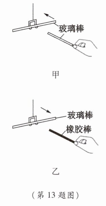 13. 用丝绸摩擦两根玻璃棒,手持一根玻璃棒,靠近另一根被吊起的玻璃棒时,现象如图甲所示;手持用毛皮摩擦过的橡胶棒,靠近被吊起的用丝绸摩擦过的玻璃棒时,现象如图乙所示。下列说法正确的是(