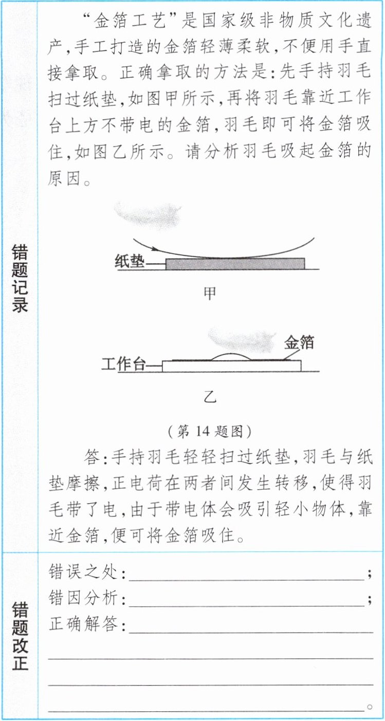错误之处:正电荷在两者间发生转移 错因分析:不明确摩擦起电的实质 正确解答:手持羽毛轻轻扫过纸垫,羽毛与纸垫摩擦,电子在两者间发生转移,使得羽毛带了电,由于带电体会吸引轻小物体,故靠近金箔,便可将金箔吸住