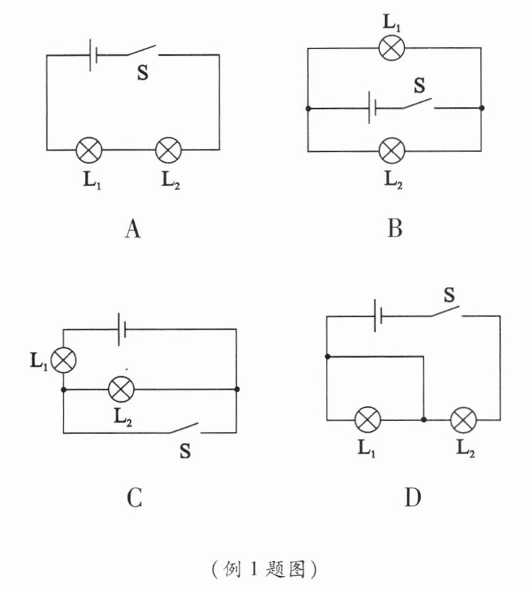 解析:图A电路只有一条路径,是串联电路;图B中开关闭合时,电流有两条路径,分别经过这两个灯泡,是并联电路;图C中电流不通过灯$L_2;$图D中电流不通过灯$L_1。$