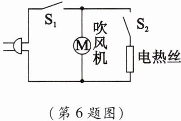 6.如图所示是一把电吹风的简化电路。分析电路可知:电热丝与吹风机的连接方式是____联。将插头插人插座,若电吹风吹出的是冷风,则闭合的开关是____。