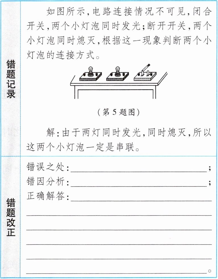 5. 在学习了电路的知识后,小原在成长笔记中记录了如下错题,请你帮助他找出错误之处、分析错因并写出正确的解答过程。