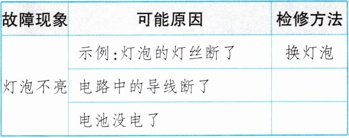 ①正确连接后闭合开关,小灯泡不亮。请在表格中填写简单的检修方法。