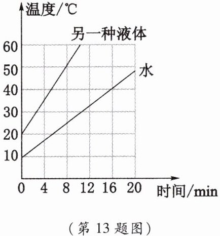 13. 小丽用相同的电加热器分别对质量为0.2kg的水和0.3kg的另一种液体进行加热,得到的实验数据如图所示,则水在16min内吸收的热量为