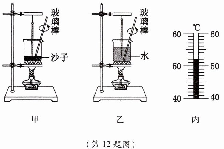 12. 探究小组的同学比较沙子和水的比热容大小,实验装置如图甲、乙所示。