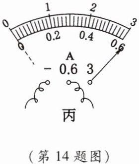 14. 如图所示,甲、乙、丙三位同学在做“用电流表测量电流”的分组实验,闭合开关前,他们的电流表指针均指在零刻度线处,当闭合开关试触时,发现电流表的指针摆动分别出现了如图甲、乙、丙所示的三种情况。请分析他们在电流表的使用上分别存在什么问题,并写在下面的横线上。