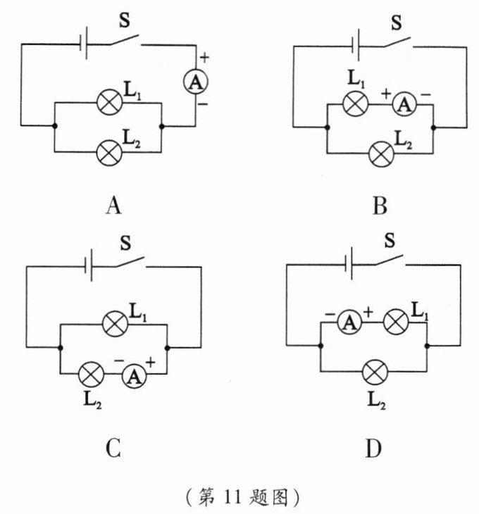 11. 下列电路中能正确测量通过灯$L_2$电流的电路是(