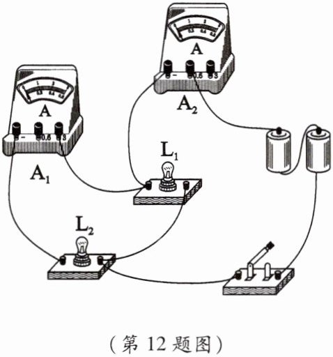 12. 关于如图所示的电路有以下判断:①$L_1和L_2$两灯泡串联;②$L_1和L_2$两灯泡并联;③电流表$A_1测通过灯泡L_1$的电流;④电流表$A_2$测电路中的总电流,其中正确的有(