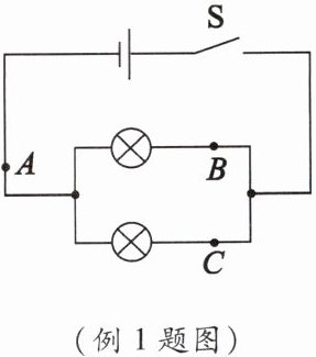 例1 在“探究并联电路中干路电流与各支路电流的关系”的实验中,小明连接好如图所示的电路,用电流表测出A、B、C三处的电流分别为$I_A = 3A$、$I_B = 1.5A$、$I_C = 1.5A$,他将数据记录在表格中,下一步的操作是(