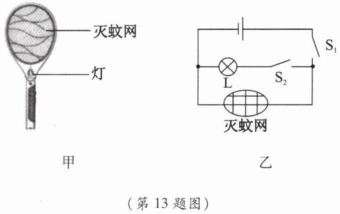 13. 如图甲所示的灭蚊拍具有灭蚊和照明功能,其工作原理如图乙所示。当闭合开关