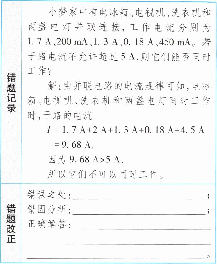 错误之处:200mA=2A、450mA=4.5A;错因分析:电流单位换算错误;正确解答:由并联电路的电流规律可知,电冰箱、电视机、洗衣机和两盏电灯同时工作时,干路的电流$ I=1.7\ A+0.2\ A+1.3\ A+0.18\ A+0.45\ A=3.83\ A $,因为$ 3.83\ A<5\ A $,所以它们可以同时工作