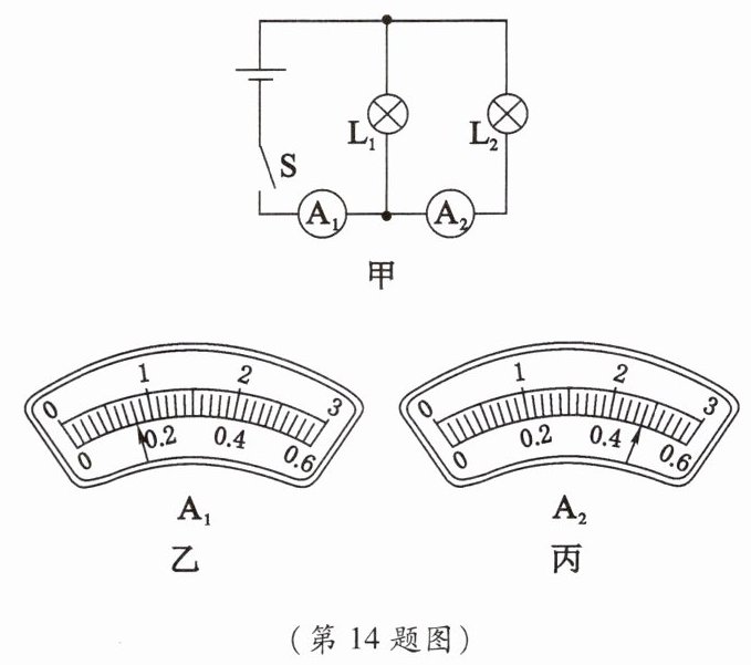 14. 如图甲所示,当开关S闭合时,两个电流表$A_1$、$A_2$的示数分别如图乙、丙所示。