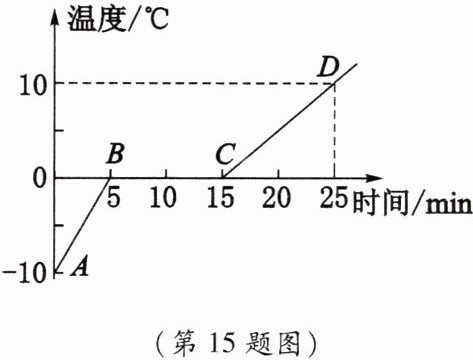 15. 小红在实验室利用电加热器完成了冰的熔化实验,并描绘出冰的温度随加热时间变化的关系图像如图所示。实验时,冰的质量为1kg,已知$c_{水}= 4.2×10^{3}J/(kg\cdot^{\circ}C)$,相同时间内被加热物质吸收的热量相同。