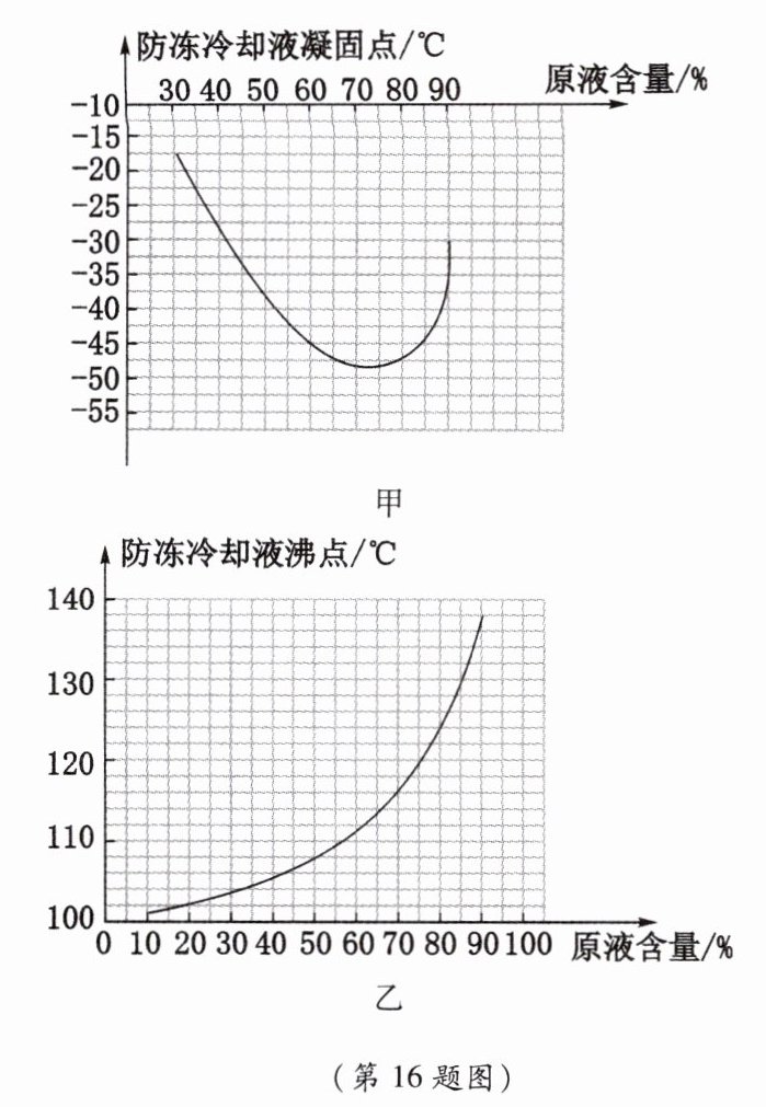 汽车行驶时,发动机的温度会升得很高,利用防冻冷却液在散热器管道内循环流动,将发动机多余能量带走,使发动机能以正常工作温度运转。防冻冷却液主要由水和不易汽化、密度比水小的某种防冻剂(简称原液)混合而成,原液含量(防冻剂占防冻冷却液体积的比例)越高,防冻冷却液的吸热能力越差。防冻冷却液的凝固点和沸点与原液含量的关系图像如图甲和图乙所示。选用时,防冻冷却液的凝固点应低于环境最低温度10°C以下,而沸点一般要高于发动机最高工作温度5°C以上。