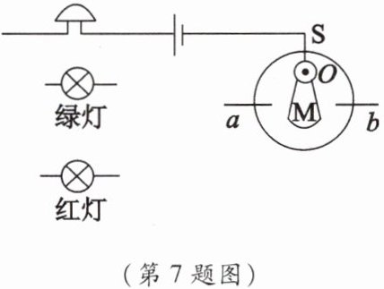 7. 某船只装有平衡警示电路,其中S为重力开关,金属片M可绕点O自由转动。当船只水平时,M在a、b中间;当船只左倾到一定程度时,绿灯亮、电铃响;当船只右倾到一定程度时,红灯亮、电铃响。请完成电路图。